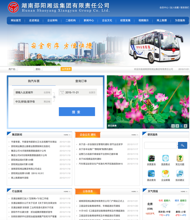 為加強(qiáng)企業(yè)信息化工作,利用網(wǎng)站推廣企業(yè)文化、提升內(nèi)部管理效率,湖南邵陽湘運(yùn)集團(tuán)有限責(zé)任公司官方網(wǎng)站域名m.xdjto.com于11月11日通過審核,網(wǎng)站次日正式上線發(fā)布。集團(tuán)公司與旗下客運(yùn)子公司均有獨(dú)立版面,可發(fā)布文件信息、動態(tài)新聞等,今后集團(tuán)公司的公文、通知等將在網(wǎng)上發(fā)布,各子公司在網(wǎng)上查看下載,極大提升了文件發(fā)布的效率。該網(wǎng)站最大的特點(diǎn)是可以查詢邵陽地區(qū)一二級車站所有車輛班次、時間、價格信息,并可在線購票,購票成功后憑密碼或身份證前往車站自動取票機(jī)(或人工售票窗口)取票,該網(wǎng)站為旅客提供了一個便捷的購票渠道。