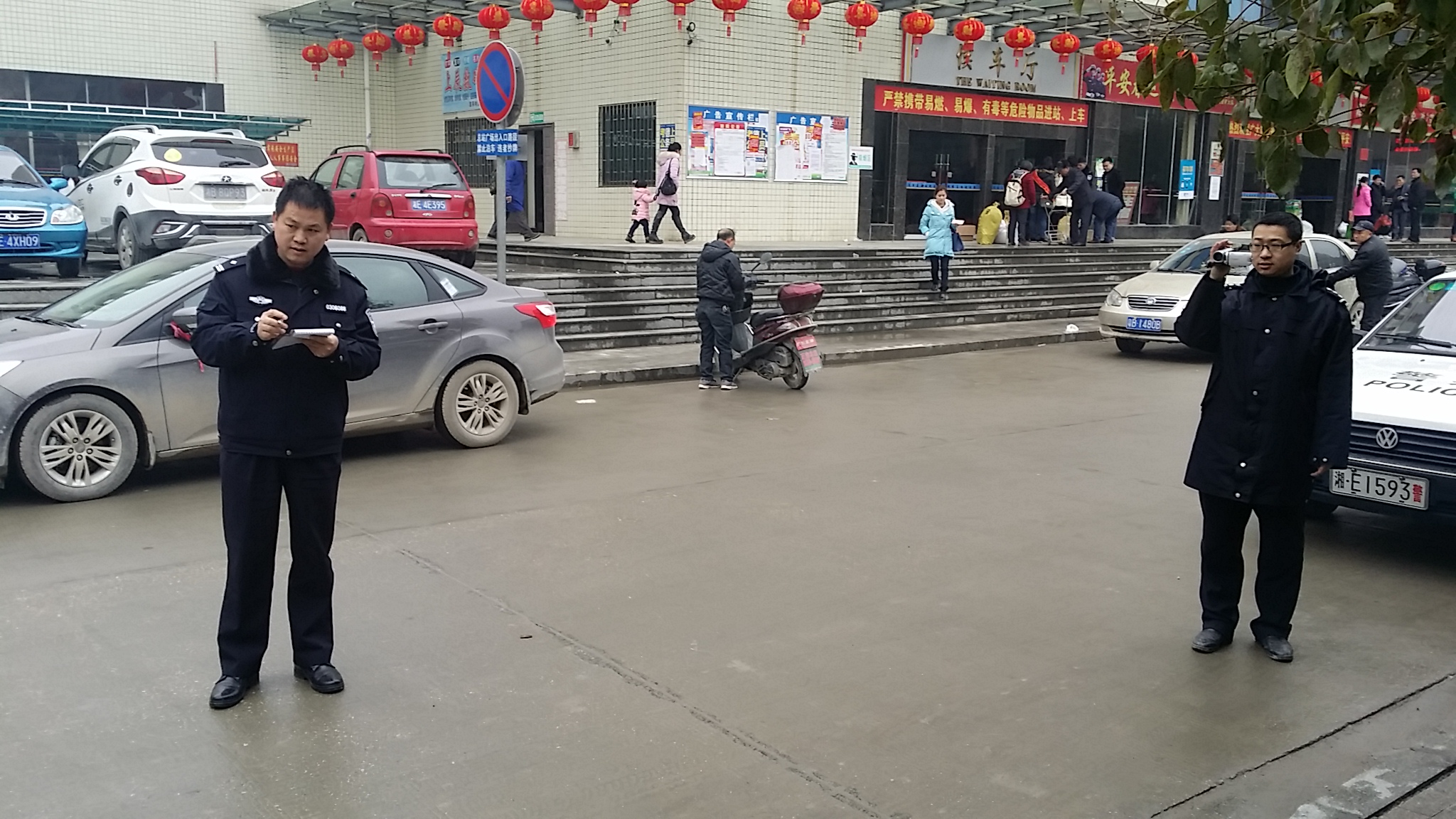 圖為湘運(yùn)集團(tuán)洞口客運(yùn)分公司稽查保衛(wèi)科工作人員配合交警部門對亂停亂擺車輛進(jìn)行抄牌錄像。